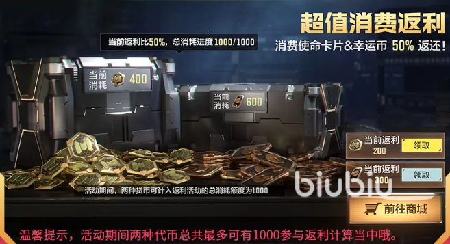活动期间累计消费使命卡片和幸运币,可以在活动页面获得50%对应代币的返利,不过注意两种代币分别仅能领取一次奖励,领取返利之后后续的代币消耗无法再次领取返利。