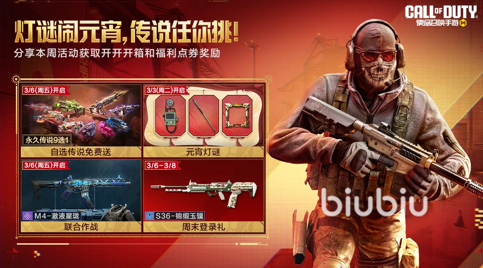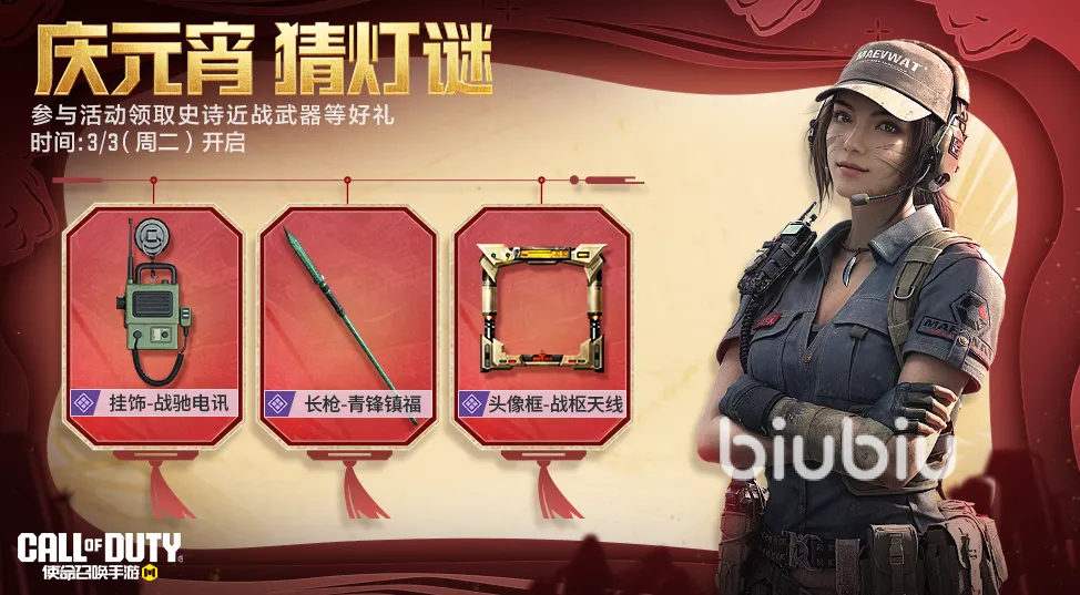 3月2号开始会有周末福利大放送,比方说3月6日到4月30日就是免费自选传说,总共有9把传说,战士们每周去完成对局积攒能量,总共集满16点能量即可兑换,每一个星期最多可以收集4点,最快四周就能拿到,此外每周首次分享活动还可获得传说武器体验自选宝箱,3月3日会开启元宵灯谜活动,各位参与猜谜答题,就可以拿到史诗级武器长枪“青锋镇福”等丰富奖励。