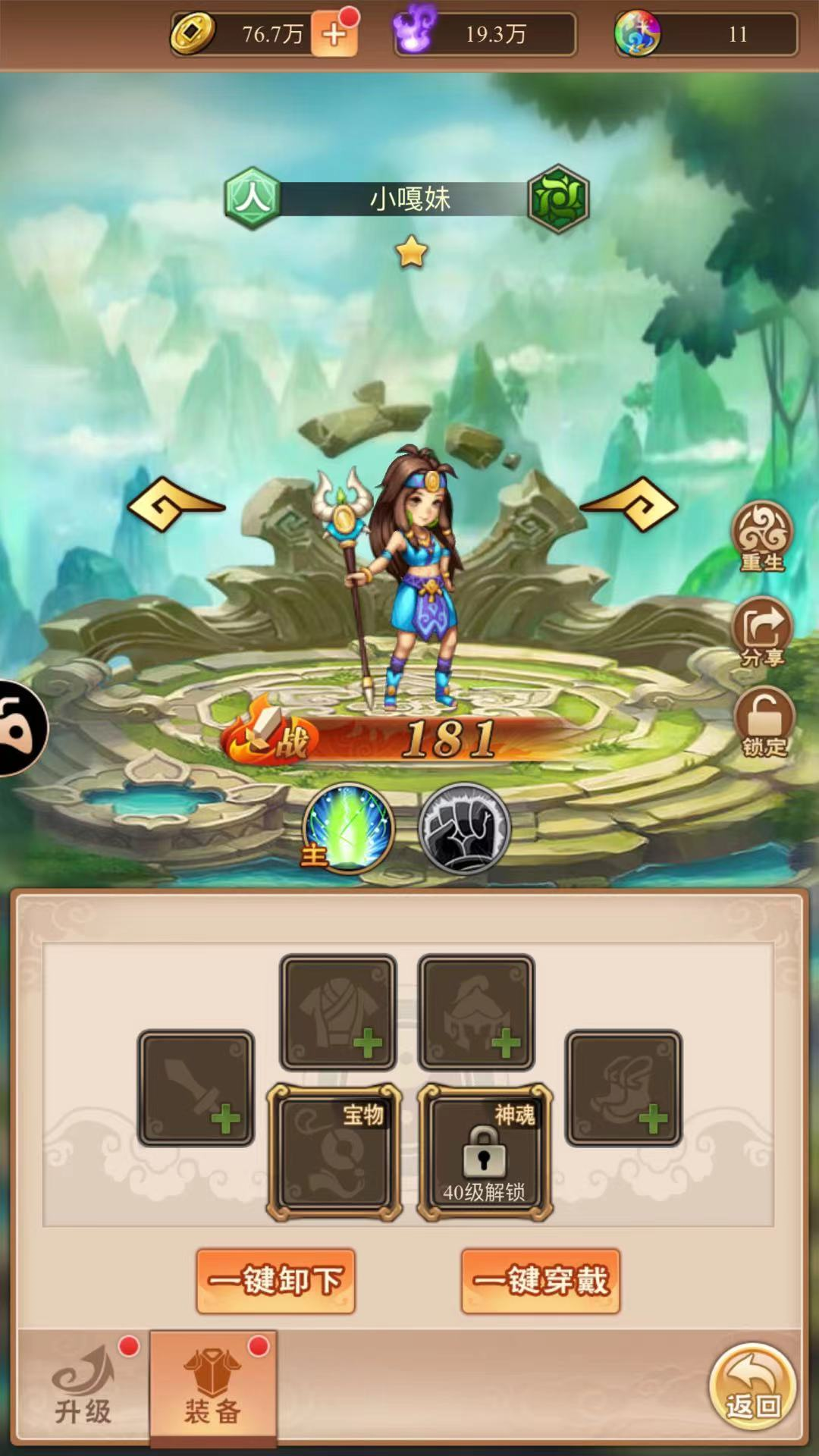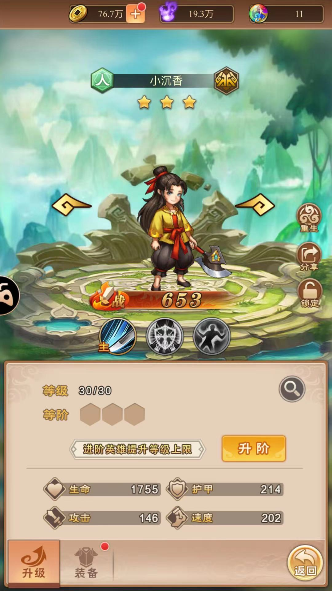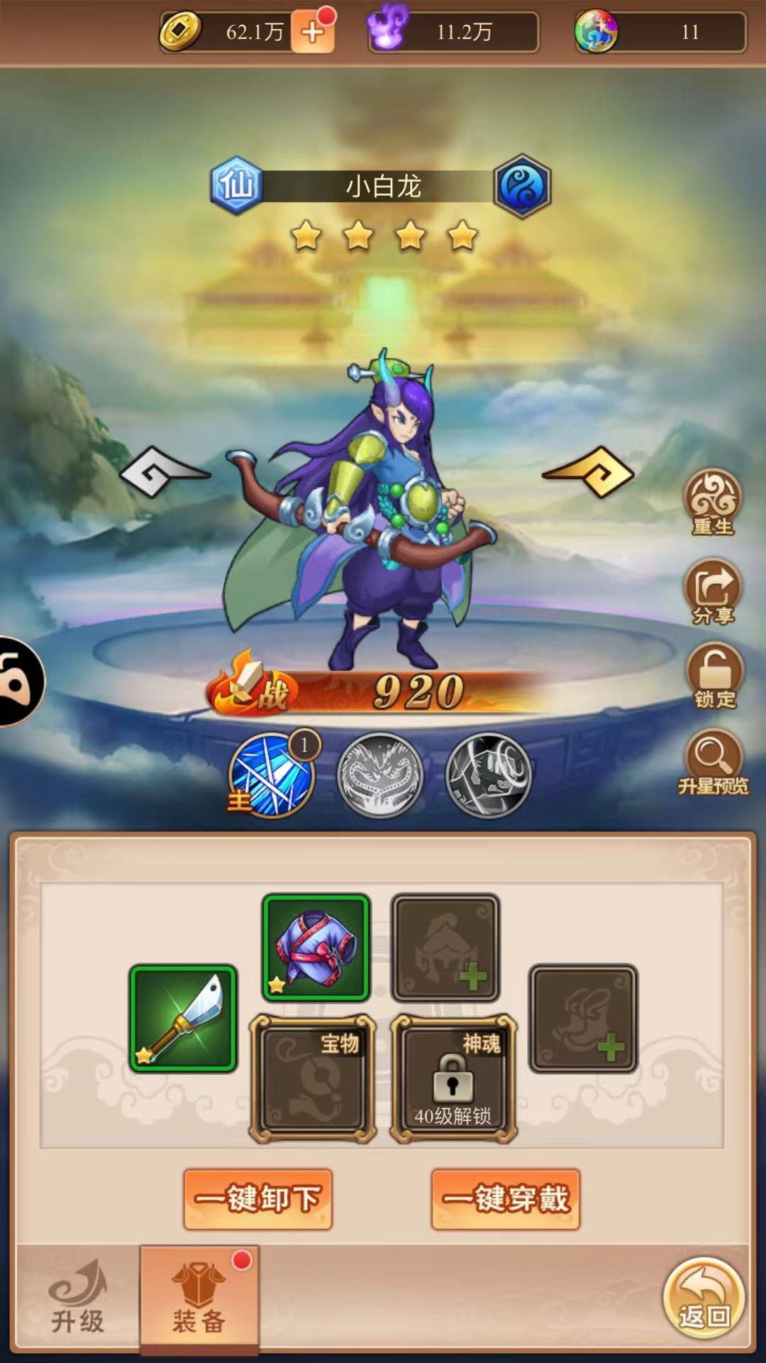 韩湘子可以通过装备进行一键穿戴进行穿戴装备,提升战斗力,还可以通过笛声悠悠,地仙之魄,潇湘玉笛等技能提升自身的伤害值并增加生命值。