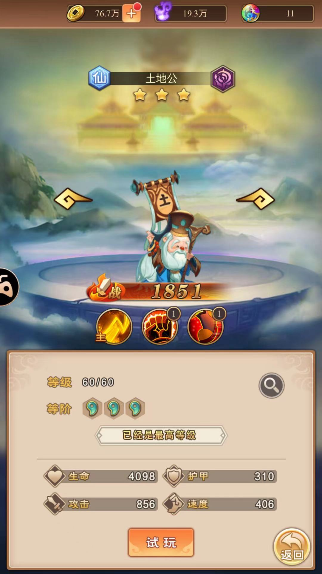 土地公属于仙家英雄,可以通过拐杖猛击,攻击增强,速度增强技能对敌人造成多重眩晕伤害,并增加攻击力和速度值。