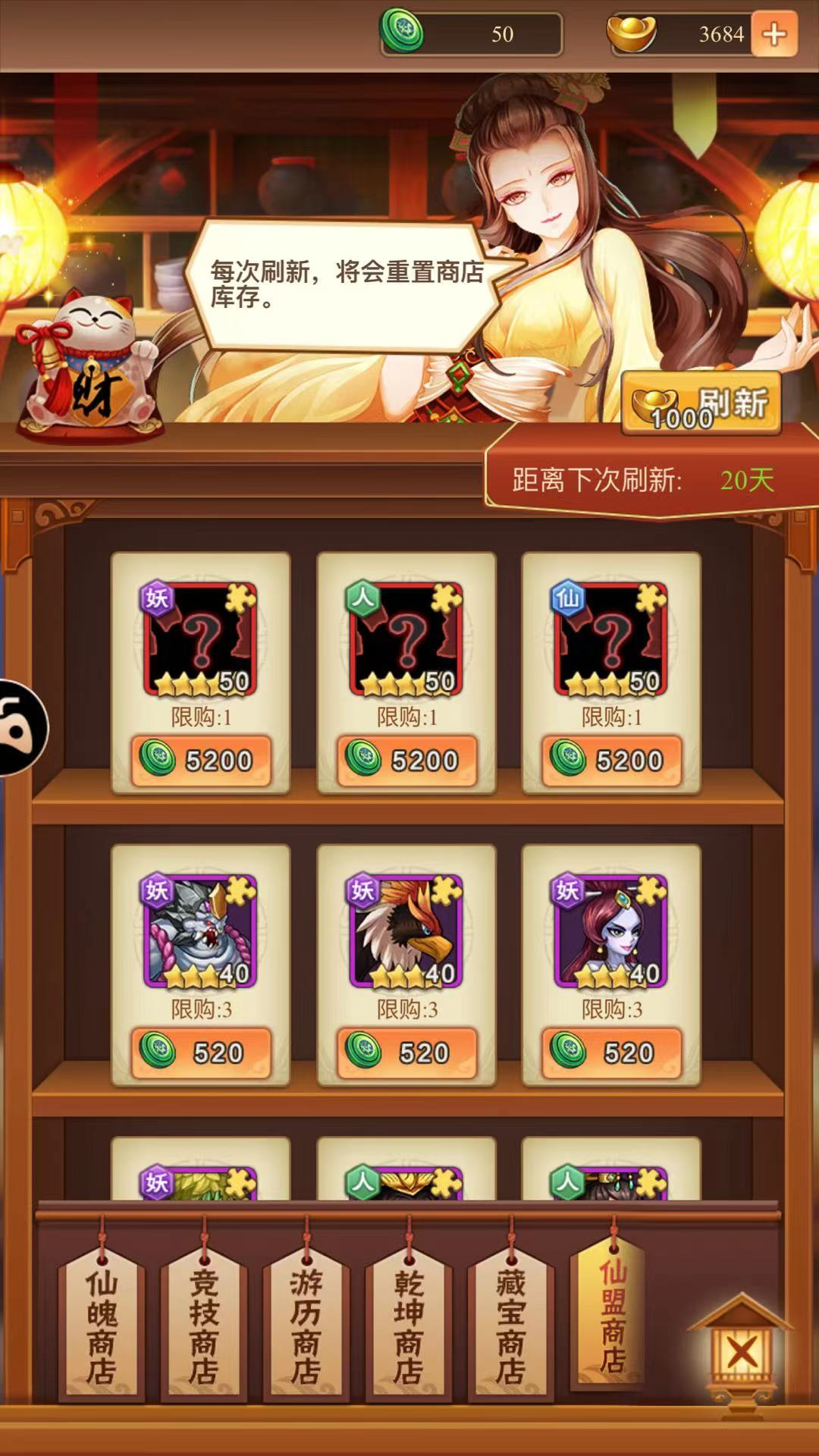 在仙盟商店中,可以通过仙盟贡献币进行兑换各种物品,可以看到物品中有一些是限购的商品,还可以通过花费1000元宝进行刷新出现新的物品。仙盟贡献币可以通过超值限购,聚魔之所和仙盟签到,蟠桃树等活动获得活动奖励。