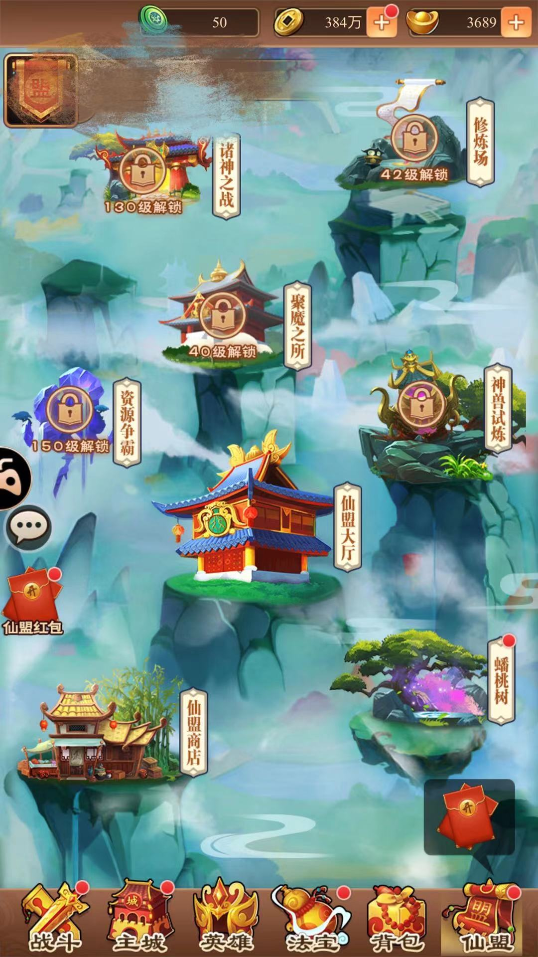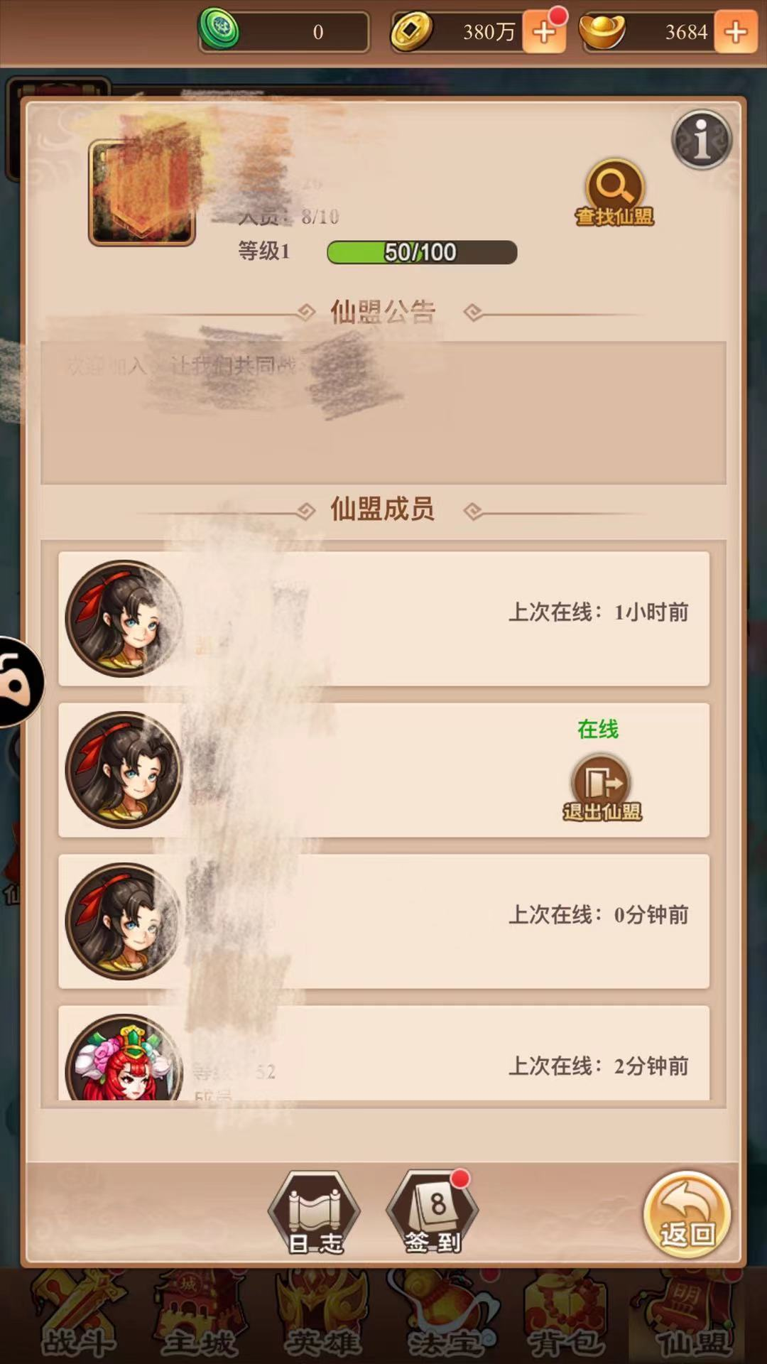 玩家进入游戏后,可以看到仙盟管理,进入条件是需要玩家的等级到达29级即可开启仙盟,玩家可以通过挑战关卡,完成主线任务获得经验值,提升等级。当进入仙盟后可以看到各种工会信息,可以选择创建仙盟火快速申请加入各仙盟,创建仙盟,需要消耗500元宝即可成功创建,还可以选择加入模式和加入等级限制。选择快速加入后,可以看到包括各种场所,在仙盟大厅中可以看到仙盟的所有成员,可以通过签到方式获得仙盟道具奖励。
