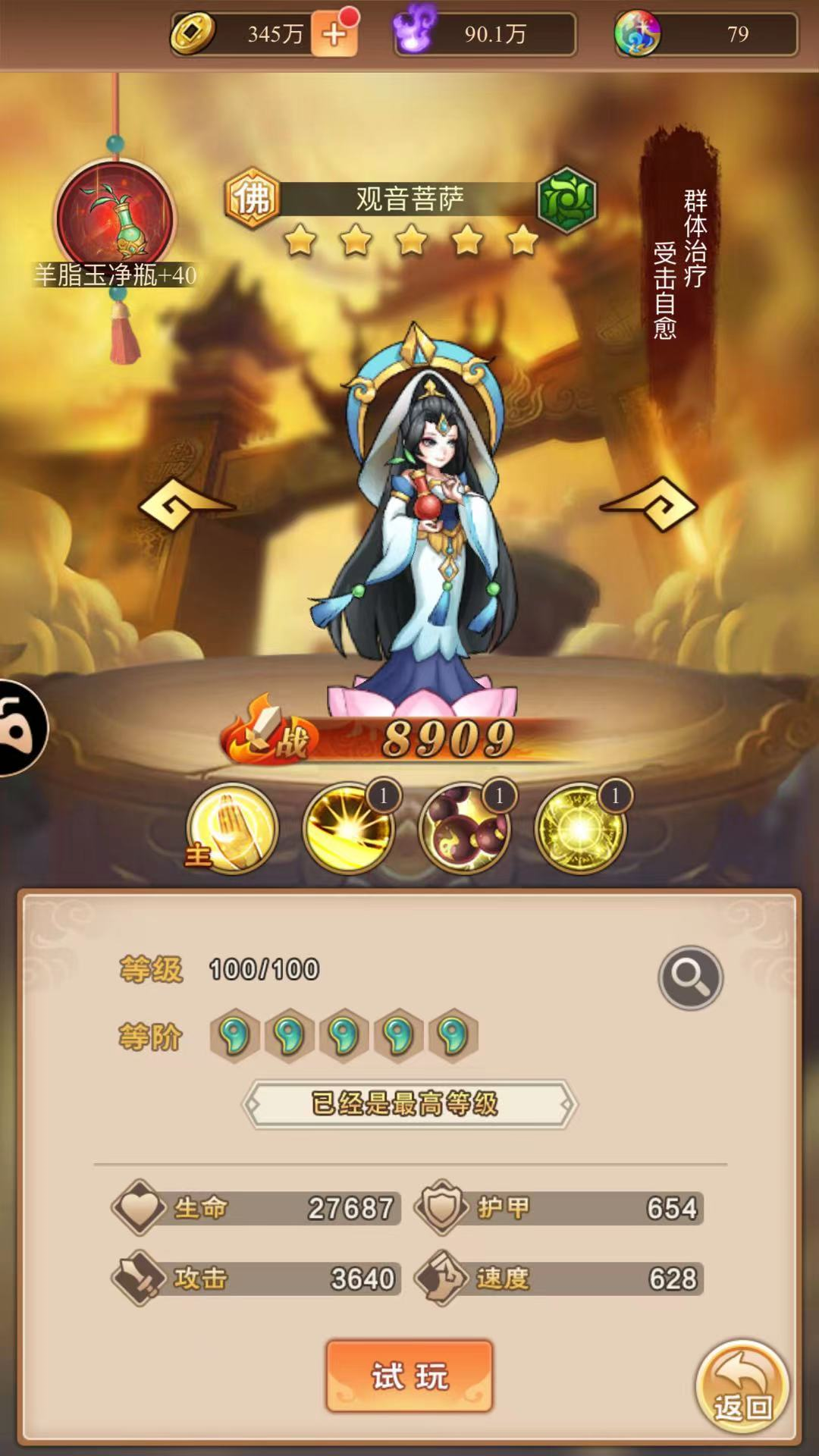 比如观音菩萨英雄,可以形成群体治疗,受击自愈的功能,在技能中有着慈航普渡,杨柳玉净,大慈大悲,莲花宝座灯技能,通过这些技能对敌人造成攻击伤害,并提升自身的生命值和攻击力。还可以通过不断的升级等级提升基础属性值和加成属性值。