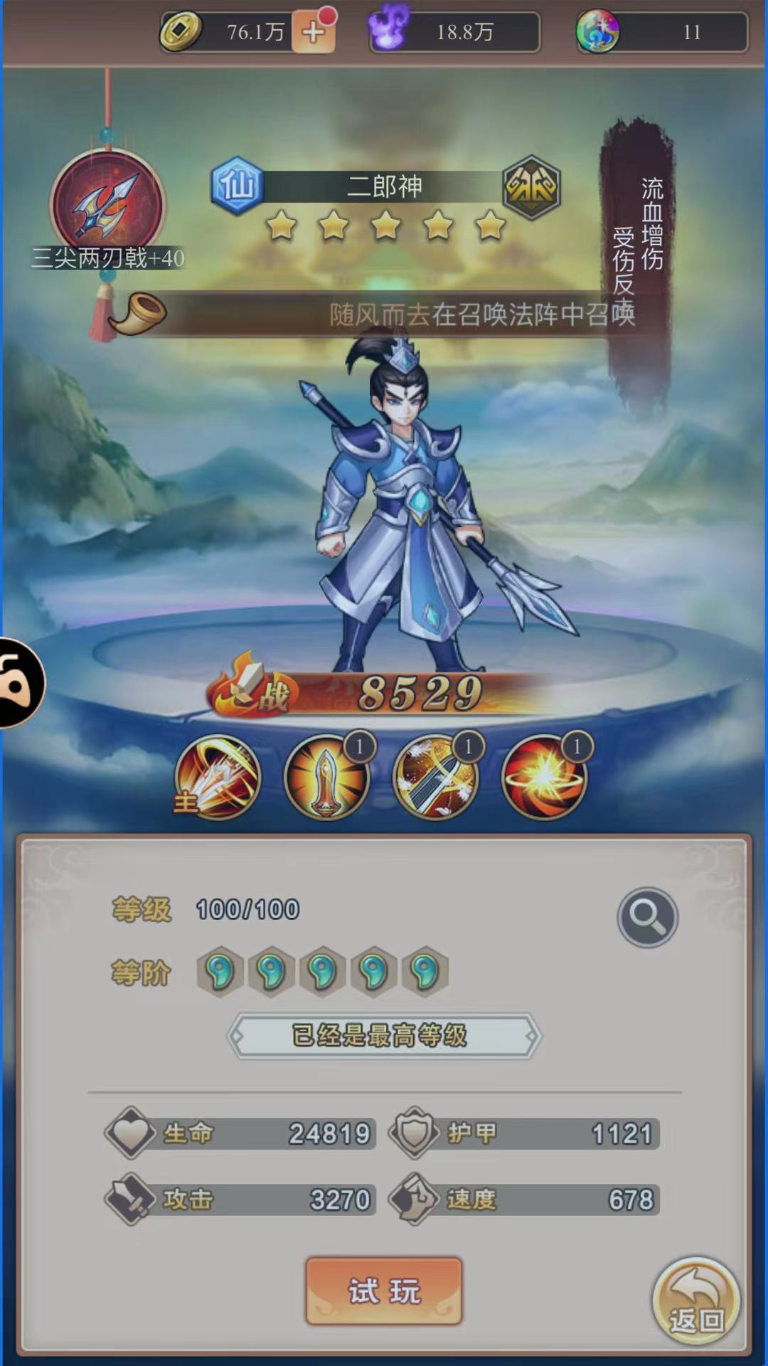 二郎神属于仙界最强的角色,有着超高的护甲值和生命值,属于流血增伤,可以反伤反击的英雄,有着威灵显赫,长戟入魂,天神之力和恃强凌弱技能,通过这些技能,可以对敌人造成多重伤害。