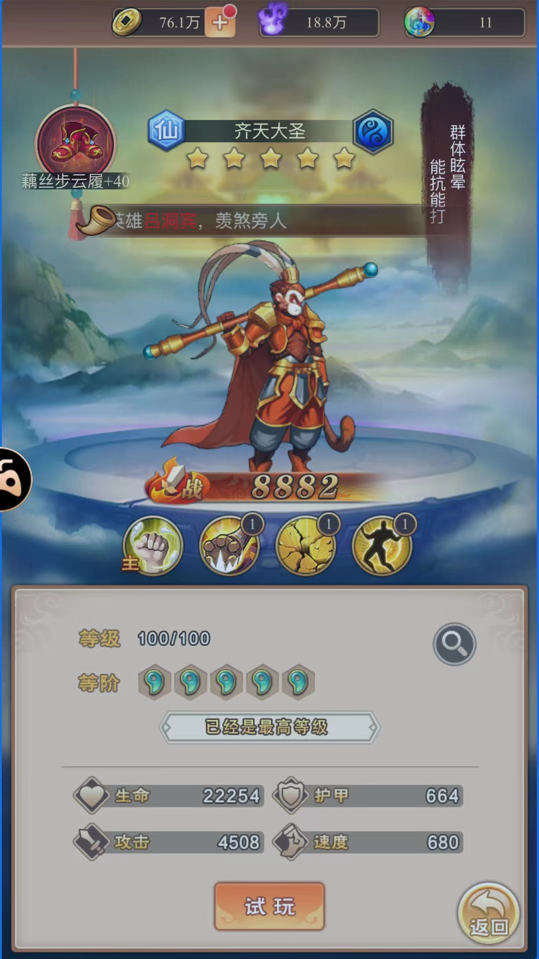 齐天大圣属于仙界中最能攻击敌人的,属于群体眩晕和能抗能打的角色,有着大闹天宫,猴王分身,七十二变,金丹塑体等技能,通过这些技能,可以增加自身的生命值和提升减伤率。