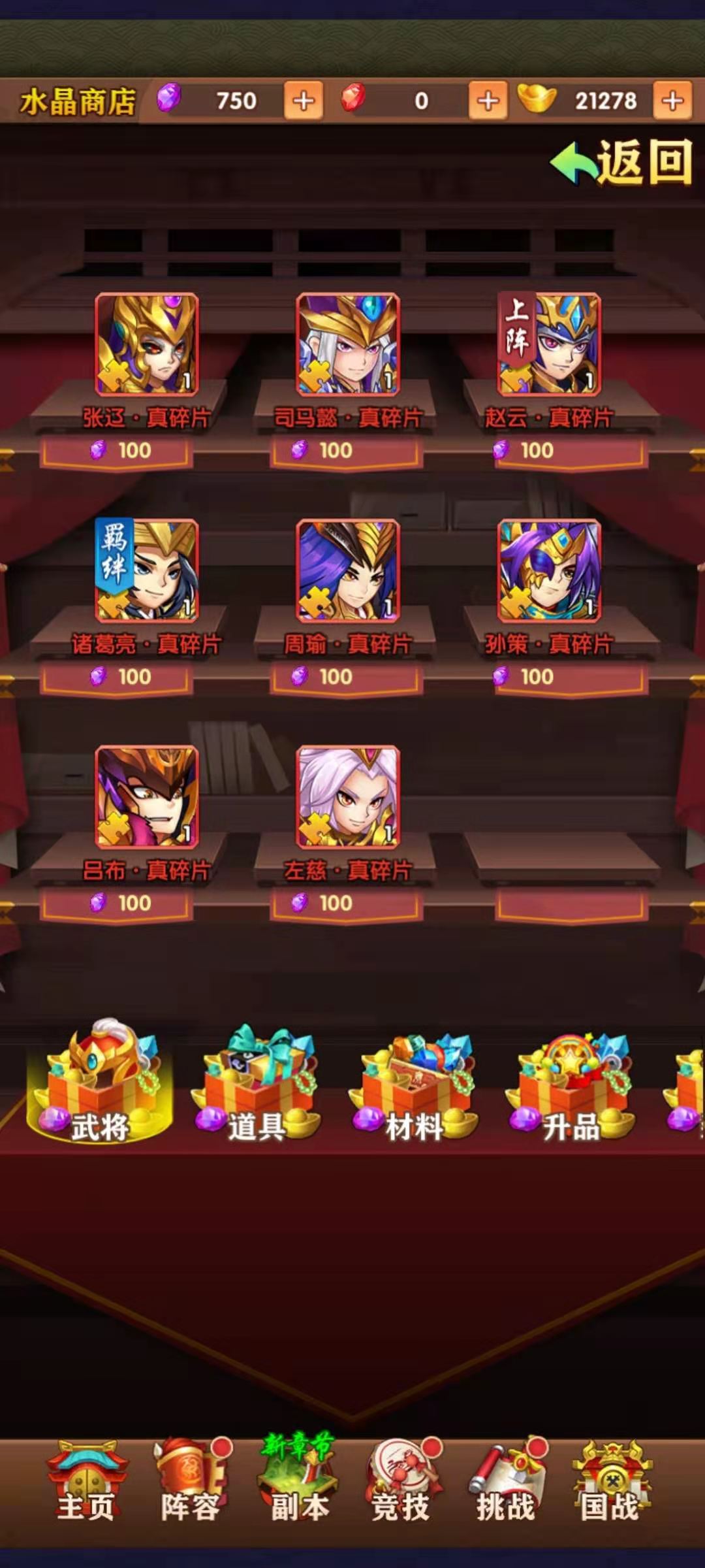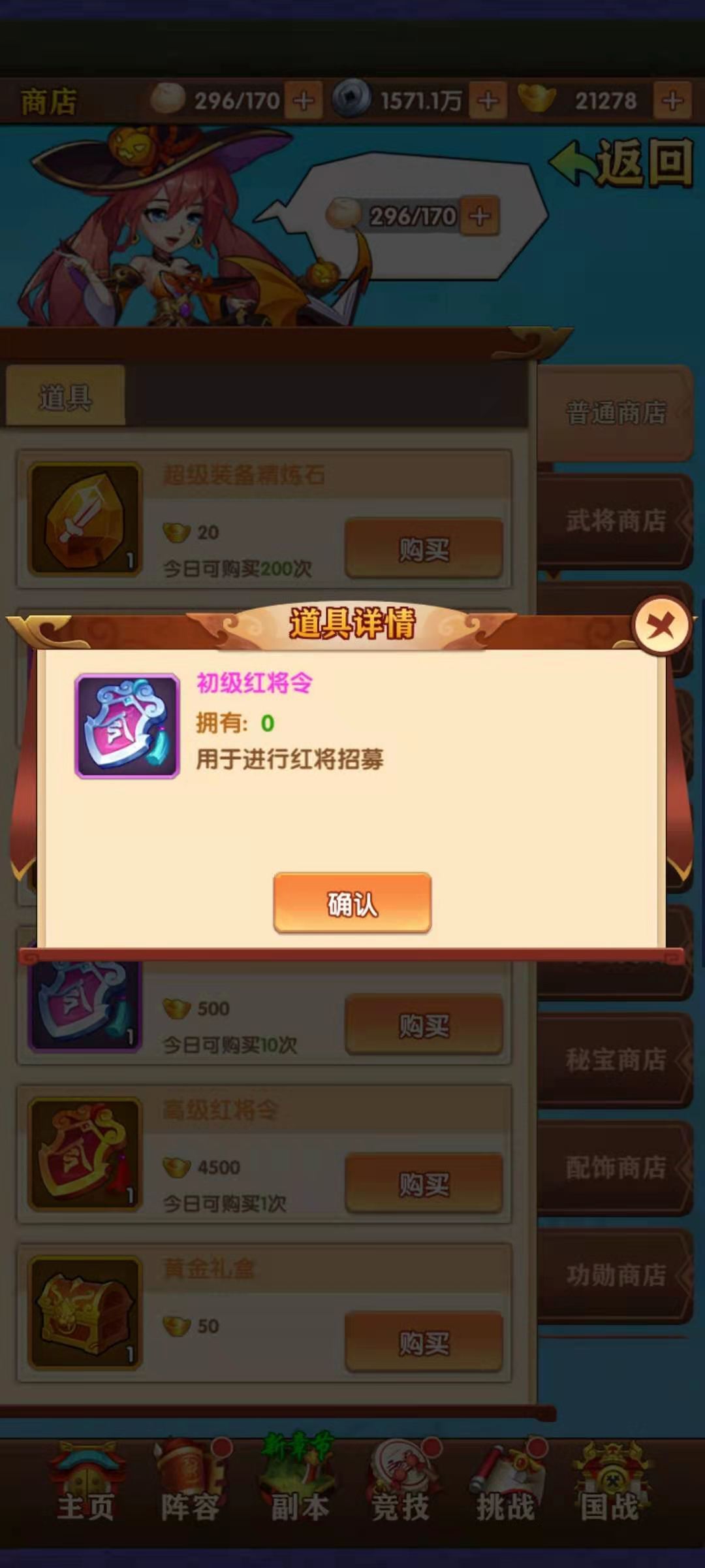 系统赠送的领完之后就需要自行招募了,在玩家达到50级之后会开启红将招募功能,通过商店购买到红将招募令,可以进行红将十连。有一定的几率获得红将整卡。虽然红将属性好,但是后期培养需要花费大量的资源,所以上阵的红将不易太多,有两个就够了,剩下的用橙将来补充。