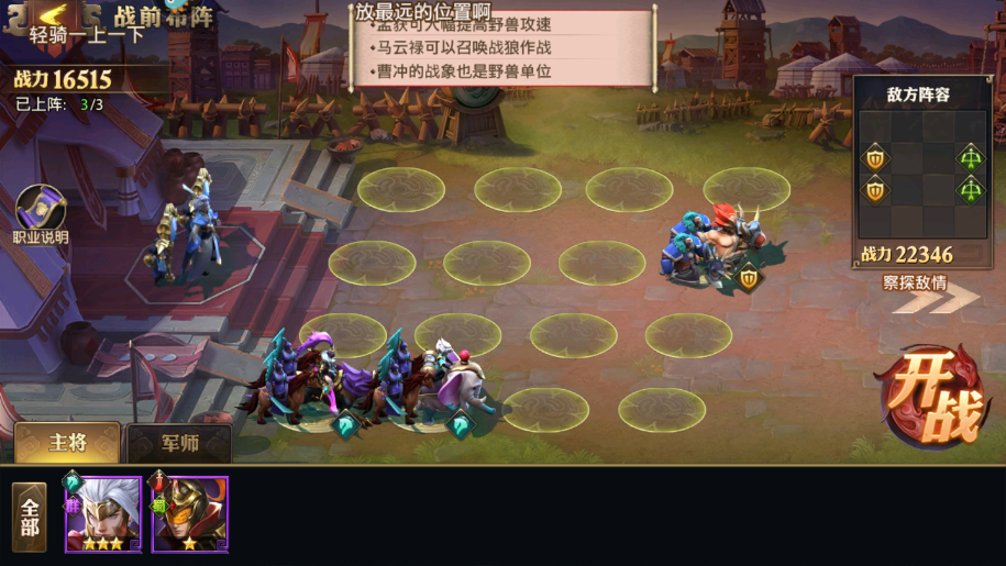 (2)过关思路:孟获可大幅提高野兽攻速,马云禄可以召唤战狼作战,曹冲的战象也是野兽单位。