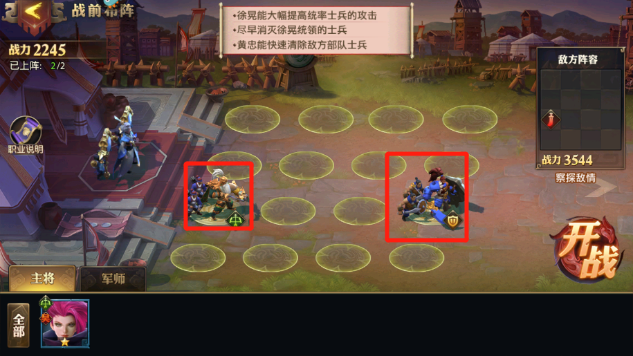 (2)过关思路:徐晃能大幅提高统率士兵的攻击,尽早消灭徐晃统领的士兵,黄忠能快速清除敌方部队士兵。