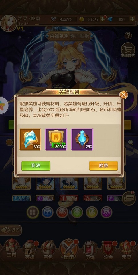 分解英雄能够获得大量的奖励,进阶石,经验,神格等等,神格可以用来兑换英雄,而进阶石则是提升英雄战力的物品。