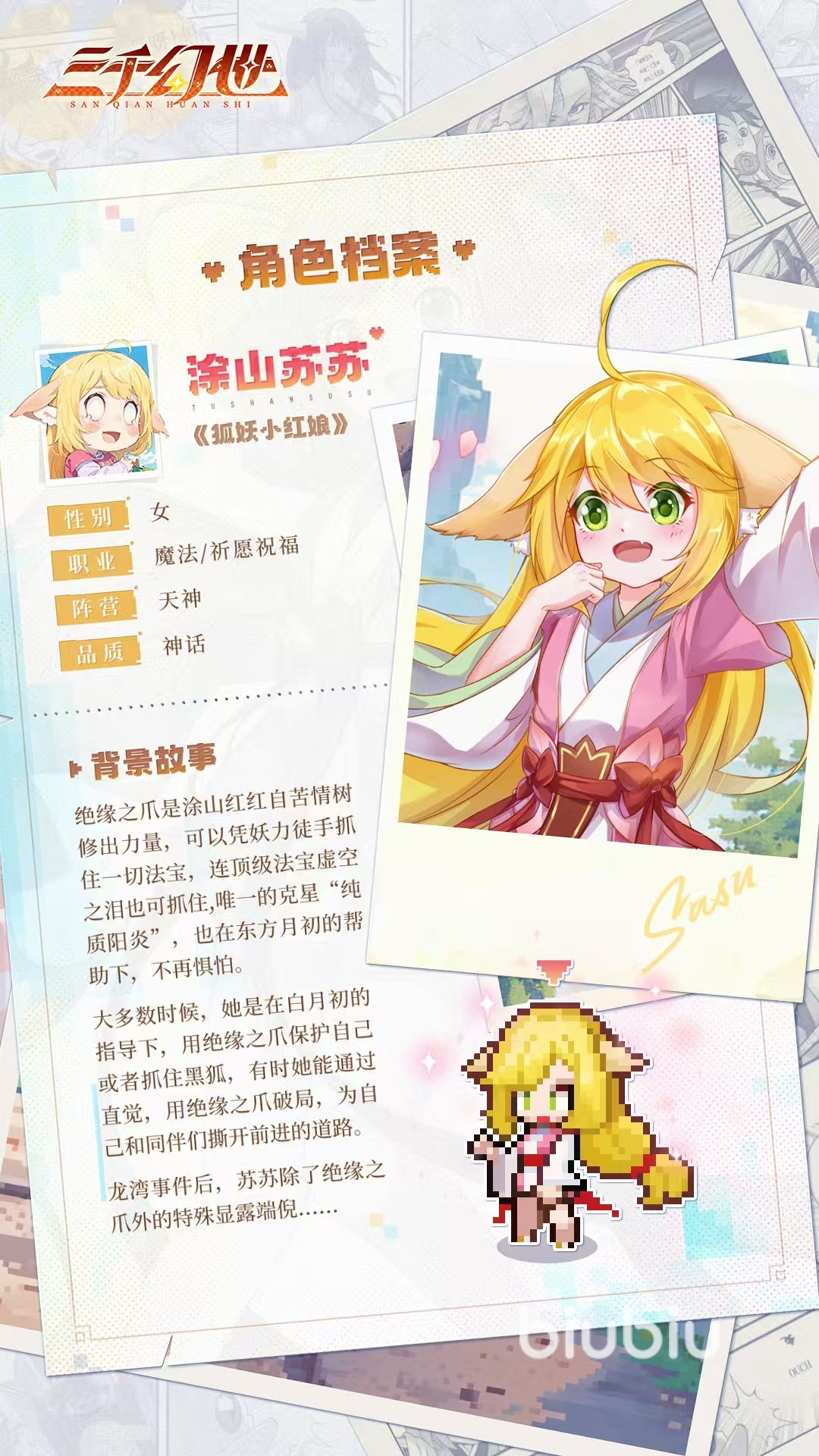 2025年03月10日 18:43 来源:亡灵宇双弹瓦斯5在三千幻世这款像素风格的游戏中,涂山苏苏外形是非常靓丽的一个,今天小编就来讲一下三千幻世涂山苏苏怎么样。涂山苏苏一直努力想要成为优秀的红线妖,是一个非常励志的小狐妖。前身修来了绝缘之爪,所以可以克尽天下万般法宝,虽然本身并不擅长战斗,但是在队伍中依然非常重要。
