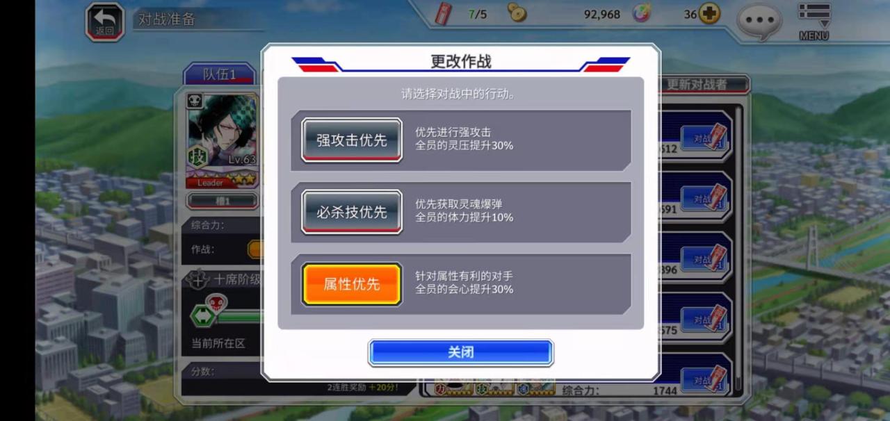 死神勇敢的灵魂有3种战斗方式,各种作战方式有不同的奖励。强攻击优先:奖励我方全员灵压+30%,作战种优先使用强攻击进行攻击;必杀技优先:奖励我方全员体力+10%,作战中优先获取战场中出现的灵魂爆弹,属性优先:奖励我方全员会心+30%,战斗中瞄准属性被克制的敌人。玩家应根据自身配队选择能克制敌方阵容的战斗方式。