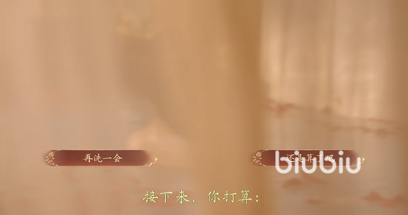 首先进入的是沐浴选衣服的场景,在这里大家可以选择再洗一会儿以及还是算了,如果选择再洗一会儿,那么就会直接对应结局五香妃,若是不进去写,就会进入到后续选衣服的过程。有两件衣服提供给大家,分别是红裙和绿裙,对应明艳和谪仙两种不同的风格。