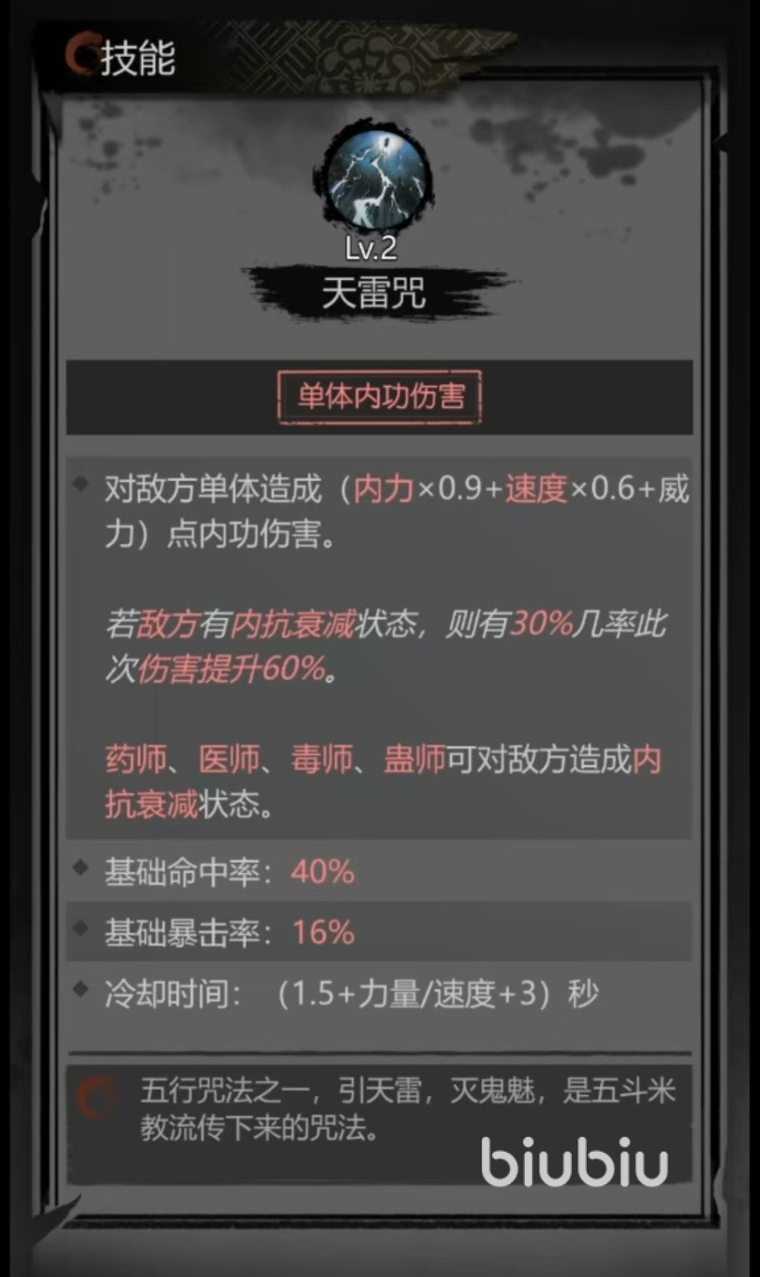 阴阳师是由方士转职而成的职业,所以也具有了方士的部分特点,在输出和辅助方面都比较出色。在战斗中,无论是单体内功输出还是群体内功输出以及群体治疗等方面,都有出色表现。自身的核心技能是天雷咒和爆炎符。天雷对双单体造成内功伤害,如果对方身上带有内抗衰减状态,则此技能输出时有机率提高伤害。