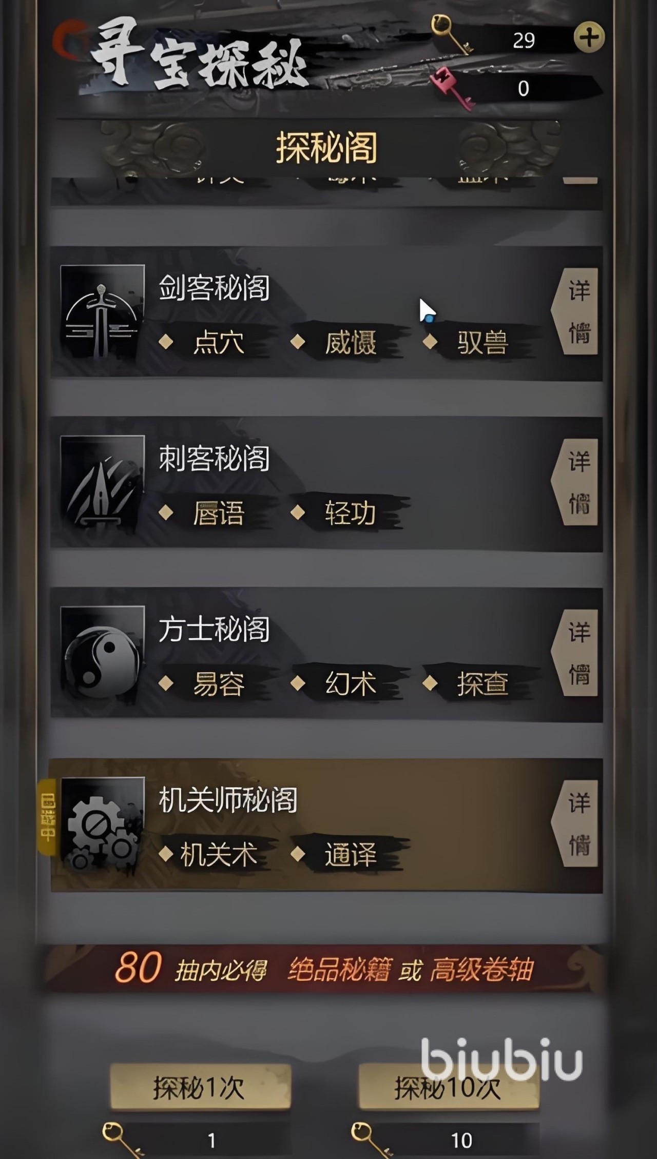 秘钥的使用主要是在在【寻宝探秘】中的寻宝中,可以选择消耗一个秘钥来抽取秘籍,也可以选择直接消耗10个秘钥直接抽10次的秘籍,可以在抽取详情中查看各类秘籍的获得概率。