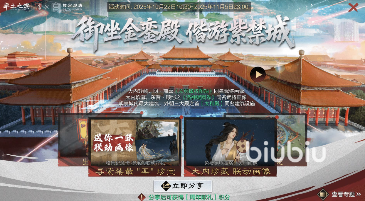联动于2025年10月22日正式开启,可在【率土庆典】中进入【故宫观唐联动】专题界面。这次联动不仅能让玩家在游戏中探寻古代名画背后的故事,更能在紫禁城恢宏的意象下,体验独属于三国与宫廷文化融合的独特氛围。活动主界面还可分享获取【周年献礼】积分,解锁更多专属奖励。