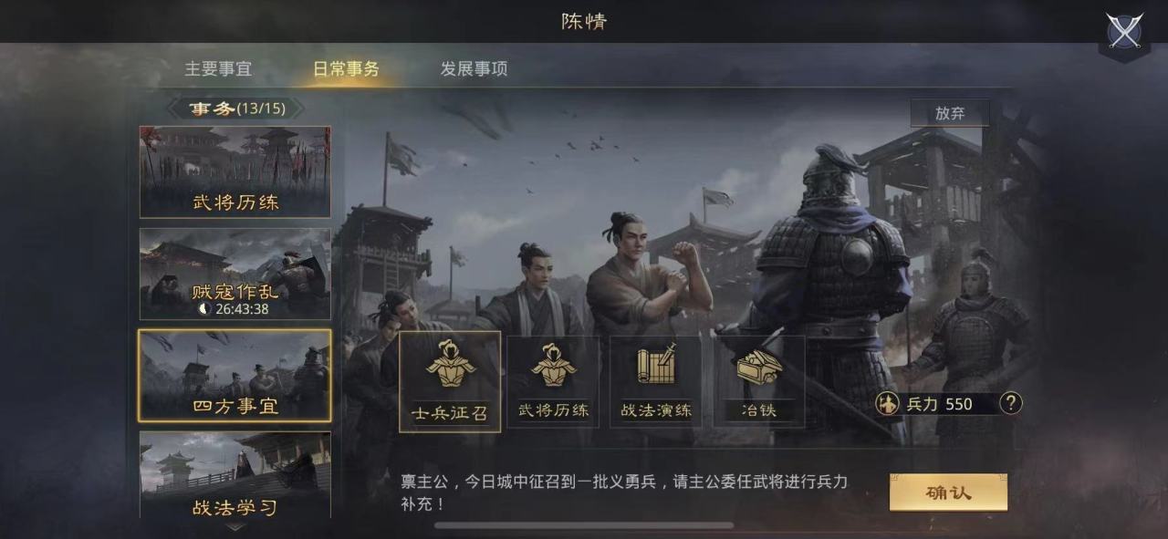 另外,在游戏内获取士兵的第二种方法就是在募兵所进行征兵,如果各位玩家想要快速征兵的话,小编也是建议大家在游戏前期可以多升级一下募兵所,募兵所的等级越高,玩家征兵的时间就会越短,如果不升级的话,到了后期玩家在征兵的时候就会显得越发的吃力,升级募兵所不仅可以快速完成征兵,还可缩短预备兵的恢复时间,还是非常有用处的。
