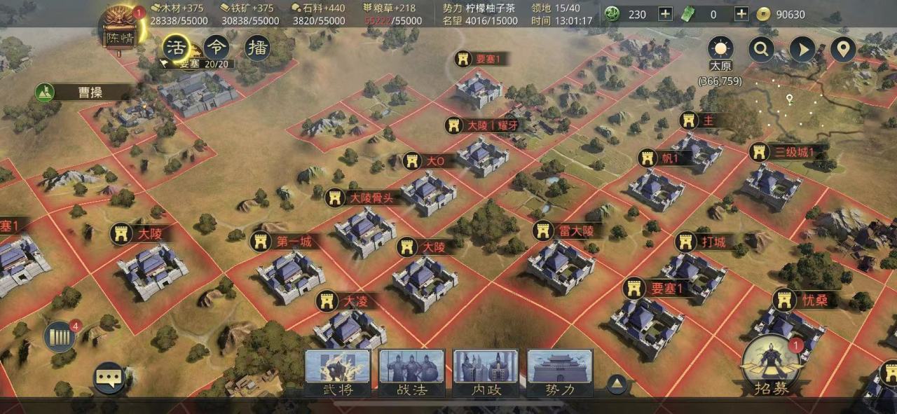 主城->5、分城->4、要塞->2、军营->2、城池Lv.3->3、城池Lv.4->3