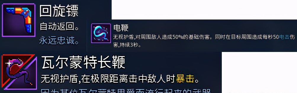 回旋镖是绿色生存派别的兵器。但是它是啥派别倒无所谓,由于这把兵器的伤害特别之高。假如跑位控得当,清怪物力量是全游戏最厉害的。然而呢,相对应的,对BOSS乏力,并且挑战新手教官门板哥——是举盾这个,会非常难。要不在副兵器塞上一回电鞭抑或瓦尔蒙专长鞭,要不就带个盾练盾反吧。