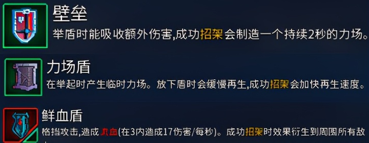 虽说过“除了突击盾其它盾牌都相同”这类话,但真要排个先行度的话撇开突袭盾还是可以分出来前后左右的。碉堡盾和力场盾的力场,实际上是无解时间。是真实的无解,疏忽受击判断的那类。因此就算不走绿流,这2个盾也是能用的。充分考虑雷盾和惩办盾的获得难度太大,血水盾成了新手输出盾的建议选择。还击盾、尖刺盾、猛推盾由于不会是群战排到后边,冰盾和贪心盾则由于非常一般。至于前方盾,和上边几位有分别吗?