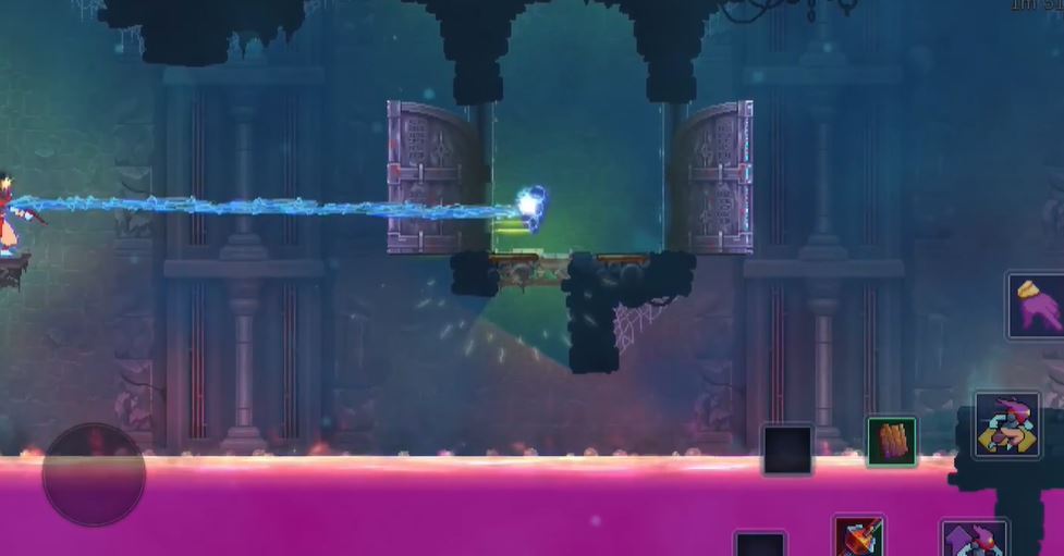 玩家先要进入初始的门,然后进入山洞里。山洞下面是岩浆,上面有一道铁门。玩家需要通过使用飞头技能,让铁门打开。铁门打开后,玩家需要二段跳跃到铁门平台就能拿到钥匙了。