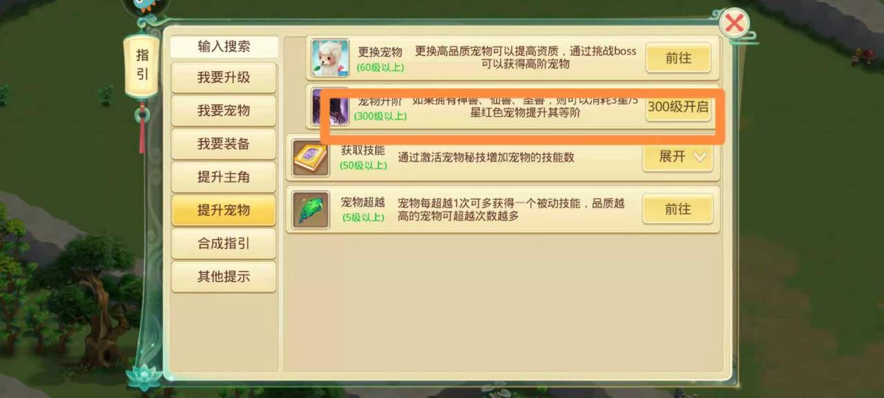 3、玩家需要获取神兽,仙兽和圣兽这三种类型的宠物才能给宠物升阶,同时也需要玩家的游戏等级达到300级时,宠物的升阶功能系统才会开启。