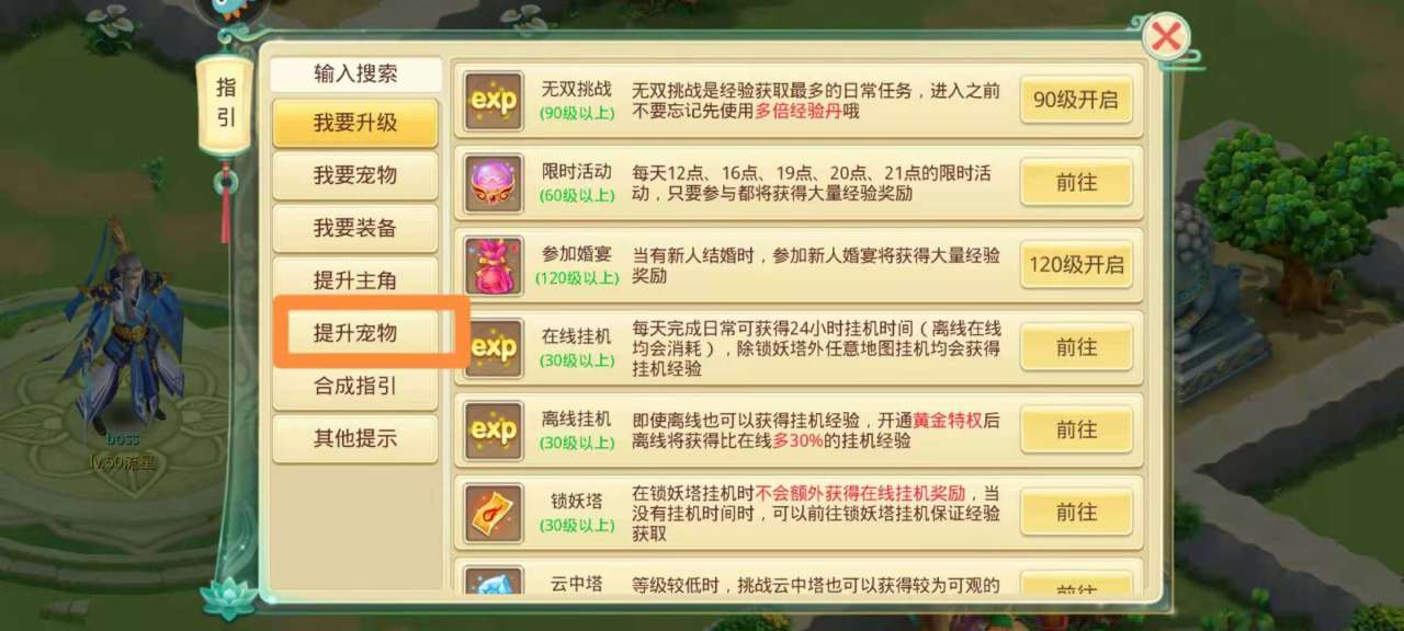 2、点击游戏的左下角的“指引”的功能系统,打开后如图所示。然后点击“提升宠物”就会出现宠物升阶的条件,如图。