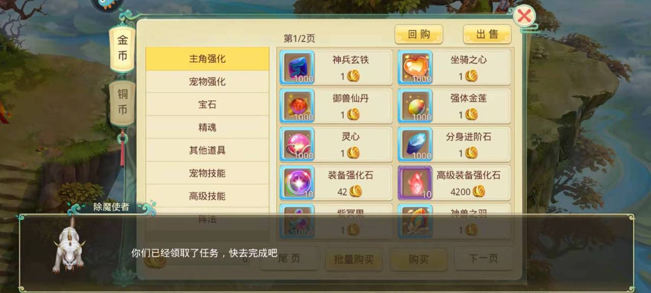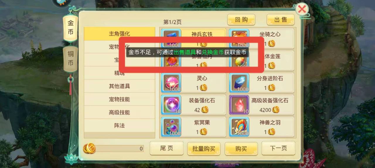 其次,这个功能系统开启之后,玩家点击它,就会开到如图所示。里面有可以让主角强化,宠物强化的物品,还有很多品种的宝石,精魂、其他道具、宠物技能、高级技能,还有阵法,在里面可以清晰的看到,里面的各种物品出售的金币都不同。如果玩家的金币不足,可以通过出售和兑换金币来获取金币购买所需的物品。