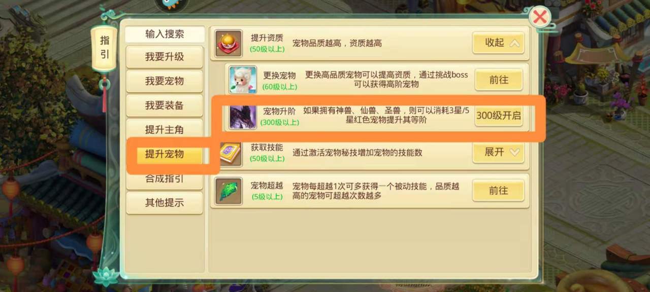点击右下角的指引进入界面,然后点击“提升宠物“后,在点击”提升资历“就可以看到一个宠物升级,但是宠物升阶需要游戏达等级到三百级才会开启。