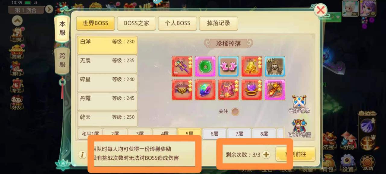 达到去击杀boss的条件,然后可以和其他玩家组队共同去击杀boss,组队时每人均可获得一份珍稀材料。要注意右边的挑战次数剩余,没有挑战次数时是无法获对boss造成伤害的。