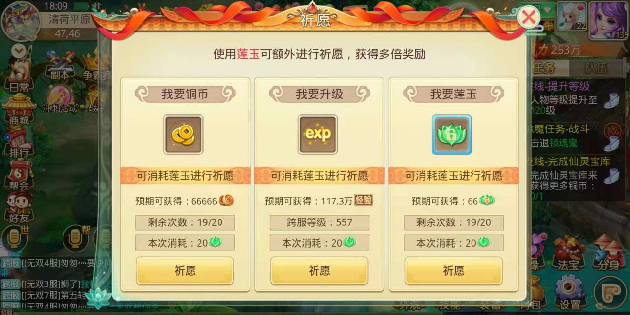 祈愿除了可以刷绑玉之外,还可以刷到其他的游戏货币,但是需要用莲玉来进行交换才能祈愿,并且每天上限是20次。