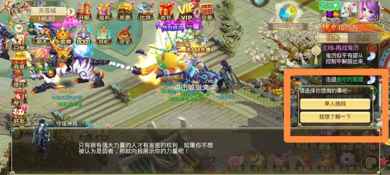 玩家在最开始的时候要完成一些主线任务,快速升级,开启“日常”这个功能系统,开启之后,点击进入“日常”的界面,找到“一战到底”并点击它,系统就会让玩家选这想要做的事情,是想单人挑战还是想了解一战到底。