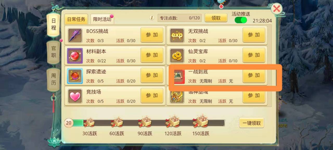 玩家要想参加一战到第的日常活动,就必须达到一定的等级,然后就才能开启“日常”这个功能系统,然后点击它进入界面,找到“一战到底”。