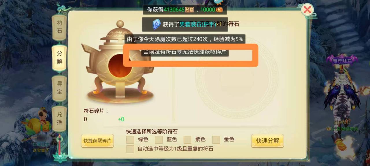 符石碎片在“分解”中可以获得,点击左下角的“快速获取碎片”即可获取。但是,要想获取符石碎片,就先要去商店中的“试炼”购买符石令,如果没有符石令就无法快速获取符石碎片,符石令除了可以快速获得符石碎片之外,还可以获取用来符石寻宝,获得符石。