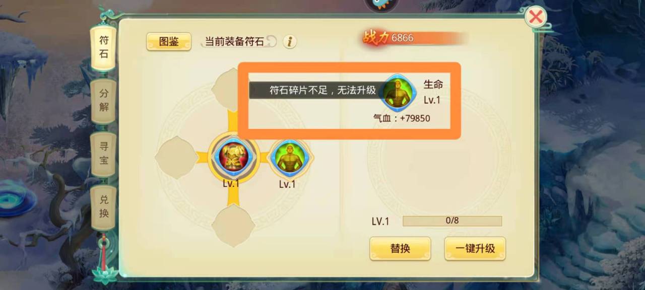 首先,点击右下角的“符石”,进入界面,随意点击一个已经获得的符石,然后点击右下角的 “一键升级”查看升级的条件,可以清楚的看到符石升级所需要的材料是符石碎片。既然知道了获取需要符石碎片才能升级,那么,玩家需要做的就是想办法获得符石碎片。