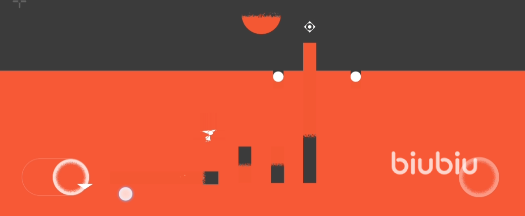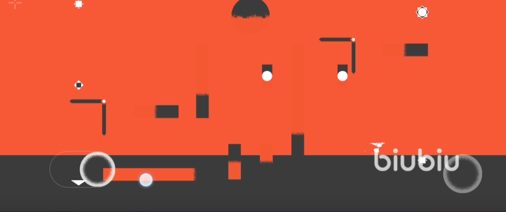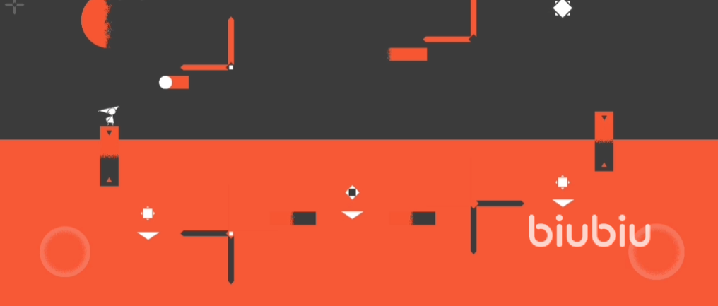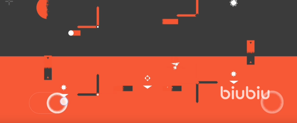 玩家一开始需要先把面前的红黑色方块变成移动状态,然后乘方块上半部分红色往下沉时,进入方块中来到下半部分的黑色世界。然后踩到白色的倒三角平台上,就可以转动直角形状的平台了,将它们转到可以踩上去的角度,一路来到下半层的最右边。