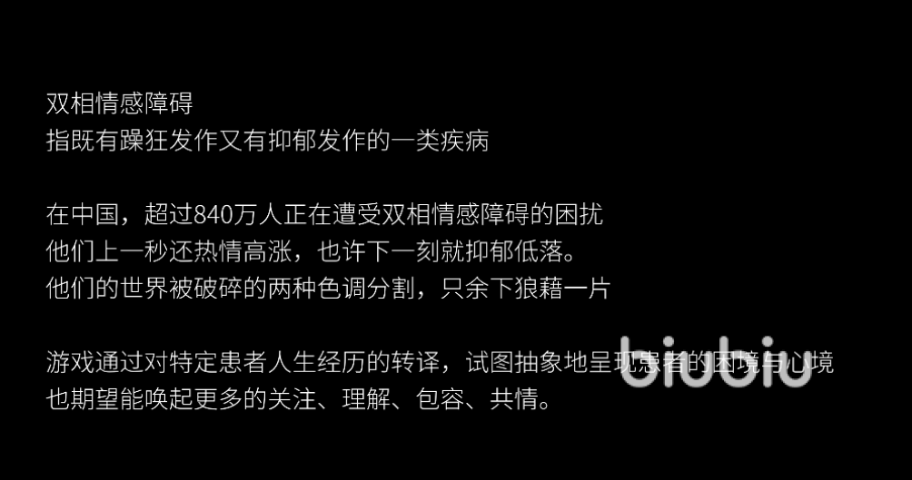 游戏刚开始会介绍设定背景,双相情感障碍是一种比较常见的精神障碍,不同年纪的人都可能患上,既然是双相,指的就是两种症状,又被称为躁郁症,症状既有狂躁症,又有抑郁症,所以有时情绪高涨,有时又低落,有时精力充沛,有时又会疲劳迟钝。