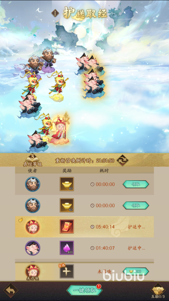 这个玩法需要小伙伴们注意的是,每天只能够进行6次,所以如何获得更稀有的奖励就非常重要,玩家的选择很重要,最高级别的护送人物是无双使者唐僧,能够获得目前来说最稀有的奖励,也就是种族召唤券,一次护送需要花费8个小时,其次就是孙悟空和猪八戒了,不过不推荐大家去选择更低的人物护送,这样能够获得奖励是非常少的,有点不划算。