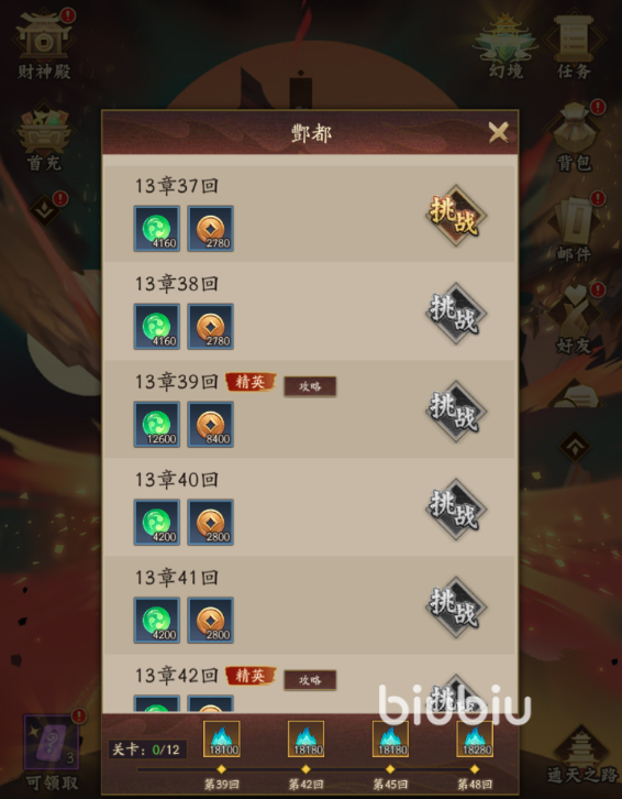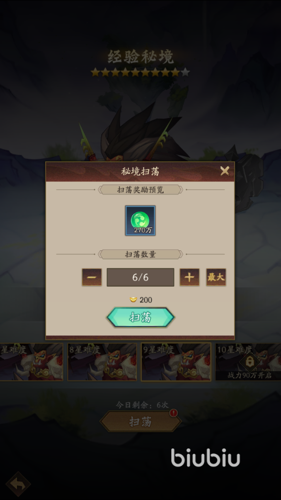 这个副本是目前来说小伙伴们快速获得各种资源的最好办法,混沌秘境中会根据玩家的等级开放不同的秘境,以40级的等级举例,一共有经验秘境、紫气秘境和碎片秘境三种,小伙伴们在挑战的时候,记得一定要先把最高级别的难度关卡打了之后,再点击扫荡,这样能够获得的奖励也更多,每天最多可以扫荡6次,需要花费200元宝,建议小伙伴们是将扫荡次数直接拉满的,这样能够保证资源不缺乏。