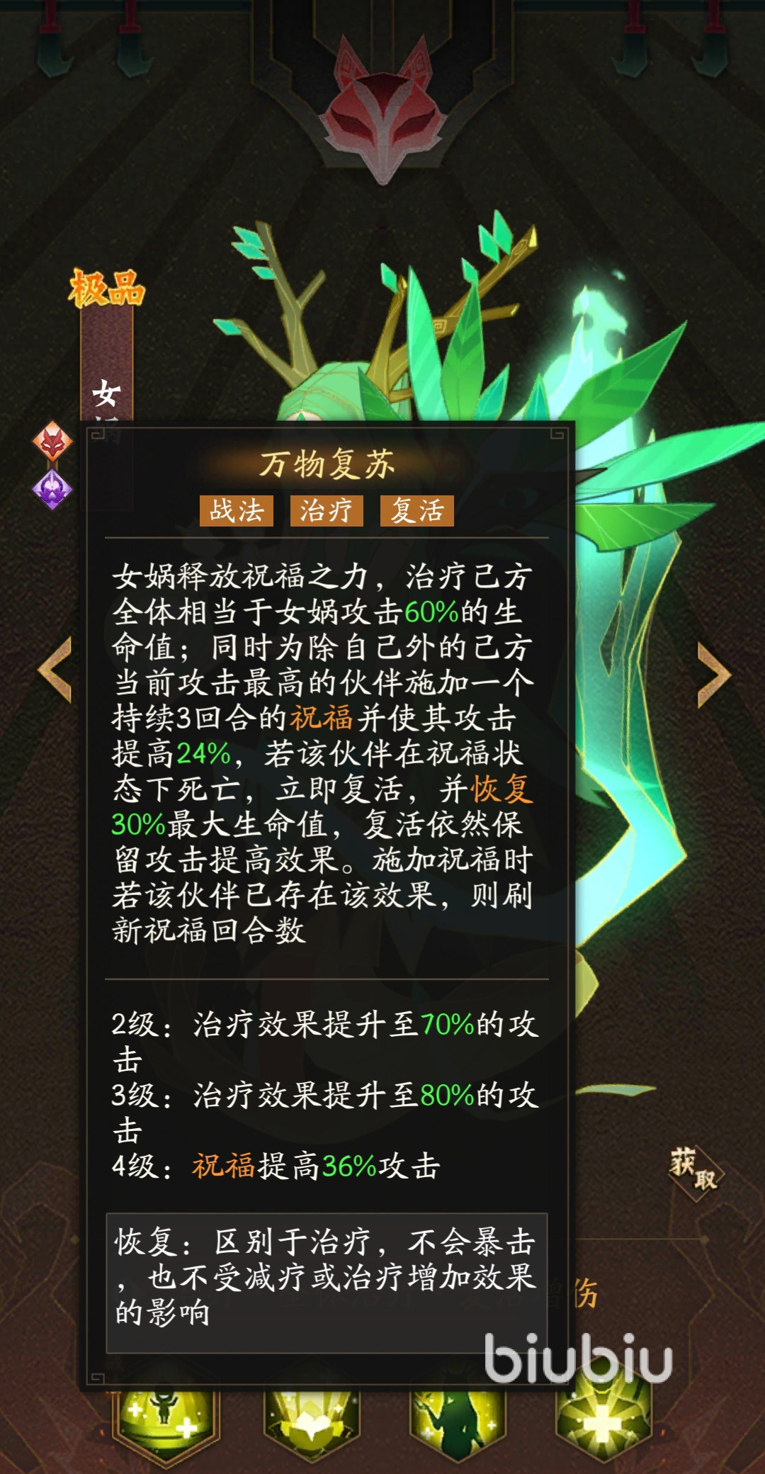 女娲技能最大特色是复活和治疗,它是游戏中少数能复活队友的,在闯关时提升队友的血量,多次治疗队友。此外,它技能带有攻击增益BUFF,显著提升队友的战斗力。