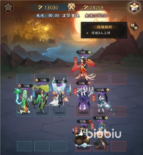 这一关卡只需要三位角色上阵,挑战难度不低,玩家成功通关之后获得丰厚的奖励。玩家最好使用女娲、杜康、飞卫三位角色,将飞卫放置在一号站位,杜康放置在二号站位,女娲放置在三号站位。