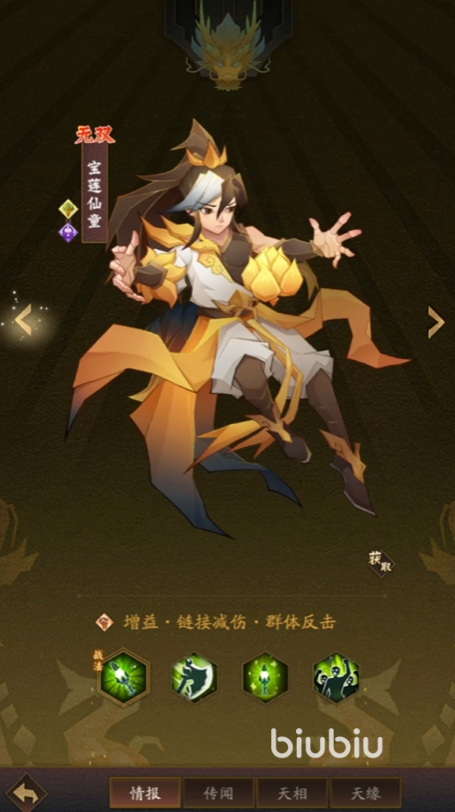 防御能力得到满足之后,大家需要使用一些辅助角色来增强队伍的反击效率。此时使用宝莲仙童在合适不过了,该角色的必杀技可以提升队伍的反击效率,让敌人的每一次进攻将承受额外的伤害,后续搭配上燕赤霞的进攻技能,对方将很快被快速收割掉。