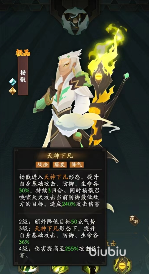 该角色可以和杨戬形成不错的输出配合,每当兵王进行了以此全体攻击之后,杨戬就可以利用技能对敌人进行收割作战,对方的整个队伍很快就会被消耗殆尽,并且兵王也可以在杨戬被打败的情况下,成为队伍当中的候补输出力量。