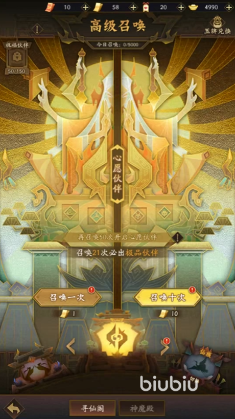 除此之外,玩家还可以依靠高级召唤来获得钟馗。不过高级召唤得到普通角色的概率较大,所以建议各位直接使用十连抽来提升得到稀有英雄的概率。平民玩家可以考虑进入boss副本中获取召唤卷轴,凑齐十个之后在进行使用。千万不要单独召唤,基本上无法获得钟馗。