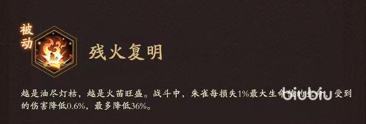 最后,各位还需要了解朱雀的被动,此技能残火福明将在其生命值越低的情况下,提供更好的防御效率,让对方无法在残血状态下一招将朱雀给秒杀掉。而玩家刚好可以利用这一特性,来让朱雀逐步发起反攻,从而赢得更多胜利。
