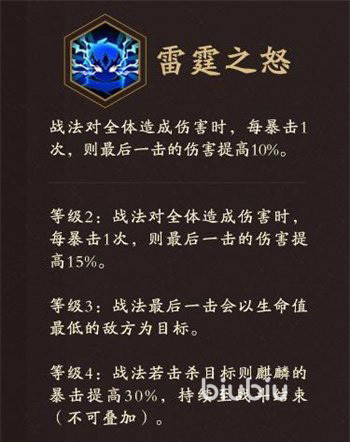 它技能雷霆之怒释放出群体攻击,每次暴击伤害提升10%,当技能升级之后,暴击伤害提升更高。
