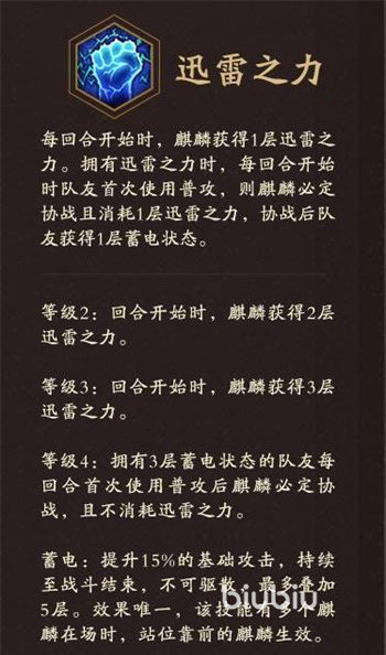 麒麟作为雷属性的角色,它拥有强大的攻击力,在目前版本中非常热门。它主要攻击技能为迅雷之力,每个战斗回合之前,开启一层迅雷之力,每回合结束之后,队友释放出蓄电状态。蓄电模式能增强普攻,最多叠加五层。