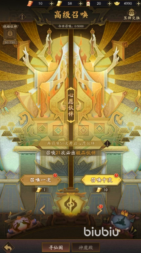 接下来,玩家又可以利用高级召唤来获取杨戬。不过此方式对于部分普通玩家不太友好,毕竟召唤道具在游戏当中并不是很好获取的,但各位可以凭借各种活动任务来累计,当可以进行十连抽的时候在进行使用。连抽也将帮助大家提升直接得到杨戬的概率。