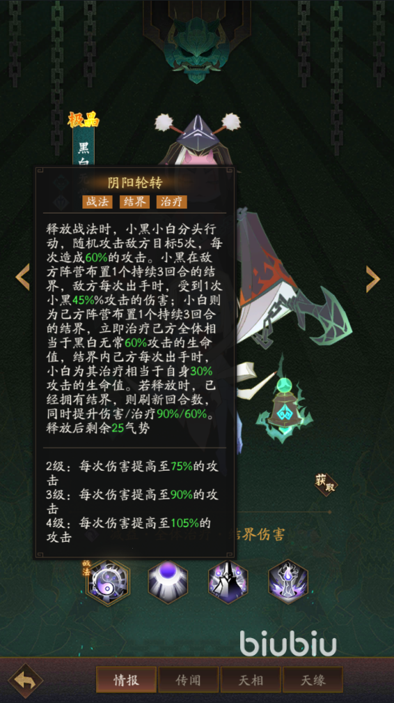 而另一个要介绍的是黑白无常,这个角色的形象是两个人物和在一起的样式,所以其技能还是可以让这两个人物分开行动的。在其使用大招之后,小黑和小白就会直接分头行动,这里会随机攻击对方目标人员五次,同时这里的小黑会在对方的队伍中放一个结界,它会持续三个回合的时间。
