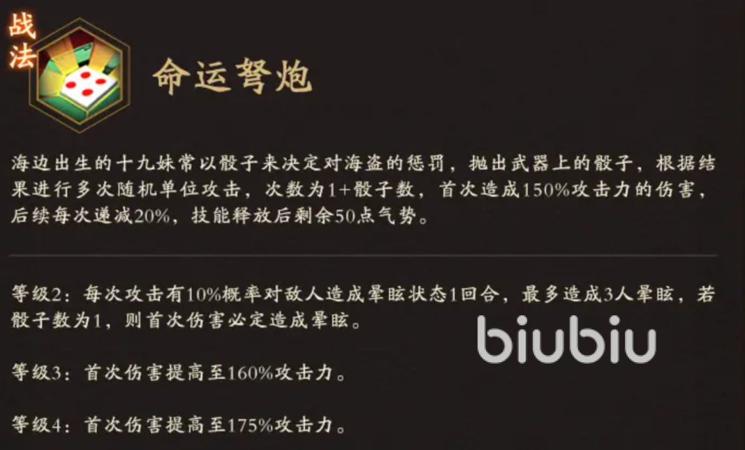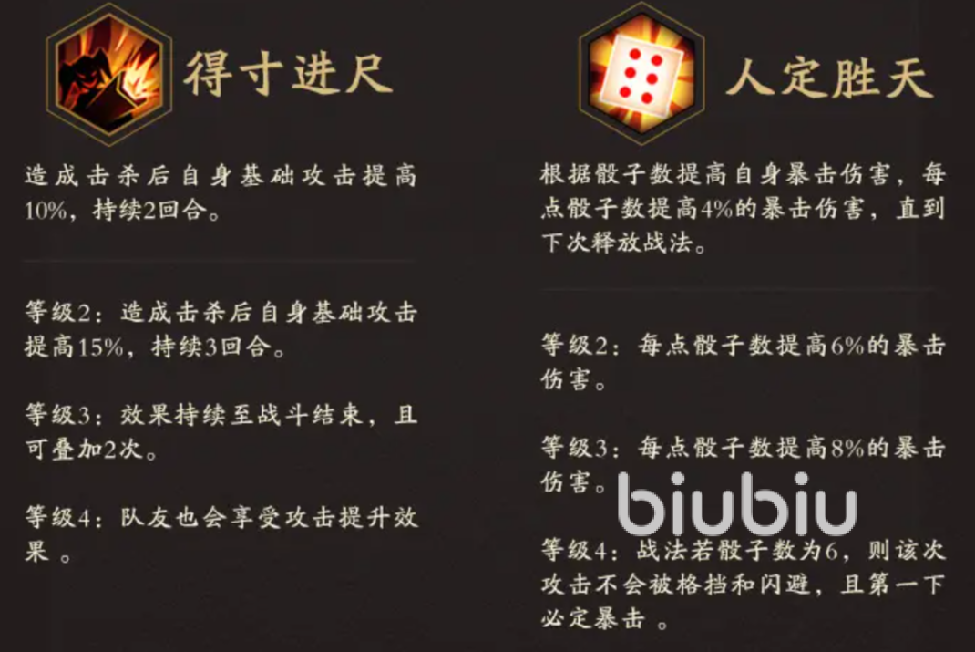 它的效果是会根据投掷出来的点数提升任务的暴击伤害,每个点数都能提升4%的伤害。另一个天相名为得寸进尺,在产生击杀的时候,角色自身的攻击力会得到提升,并且能够维持多个回合。