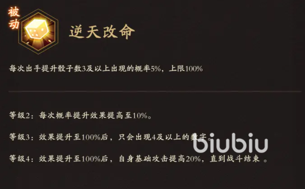 如果使用大招投掷的点数是1,那么这次攻击必定会产生晕眩效果。她有个被动能力是投掷出来的点数为3以上的概率会随着投掷的次数而逐步提升。这里再来说说她的天相,其中一个叫做人定胜天。
